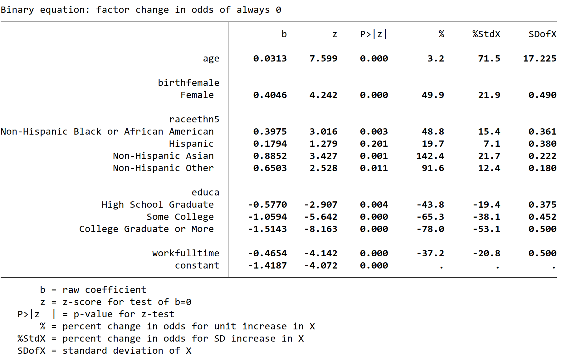 Alternatively, we can use mchange or margins commands to interpret the marginal effects. For more information, you can find the post on marginal effects here.